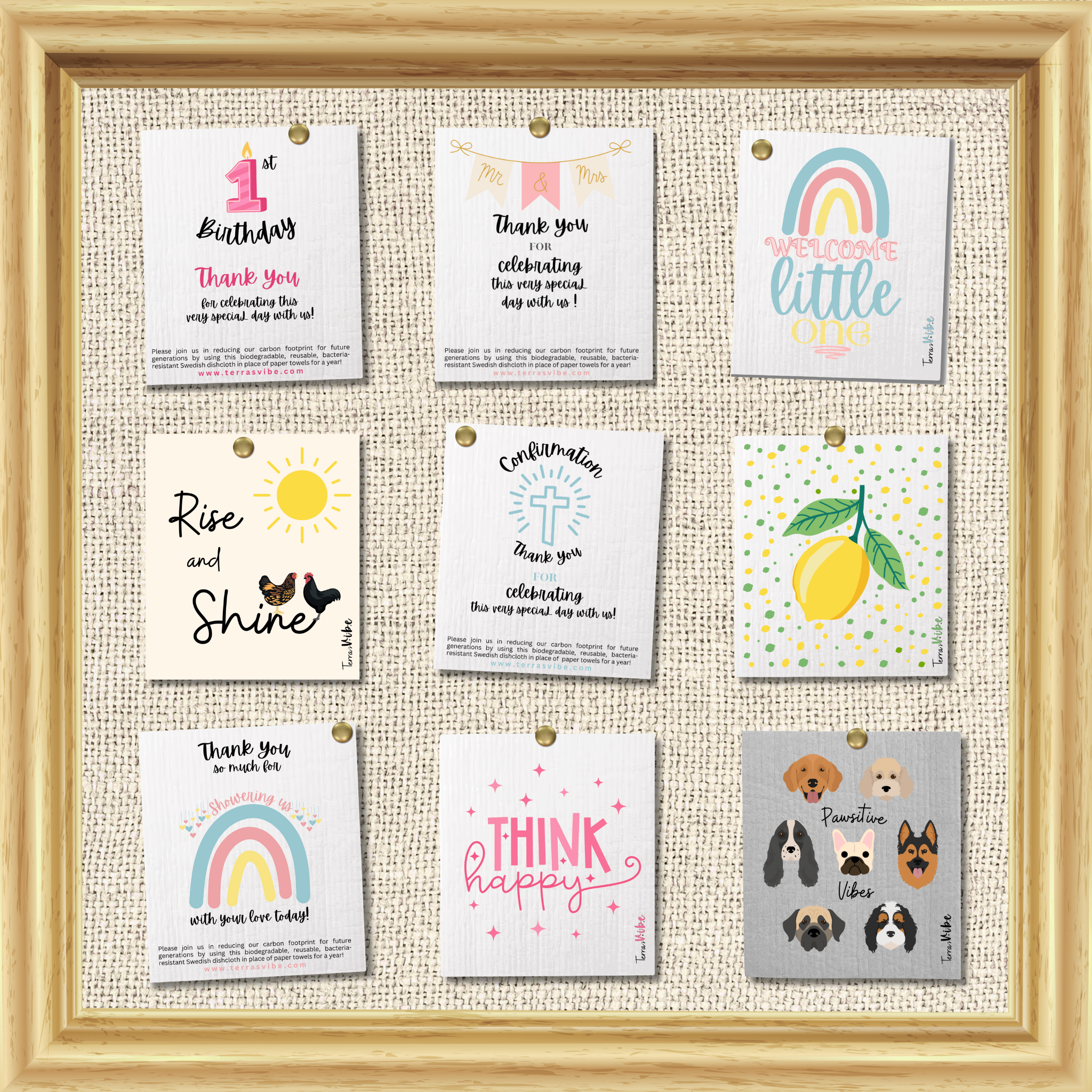A Swedish dishcloth is a thank-you gift that your attendees will actually use. When damp, your printed cloth will transform into a biodegradable, reusable, cost-effective alternative to single-use paper towels. Your guests will fondly remember your special celebration every time they use it! 💖