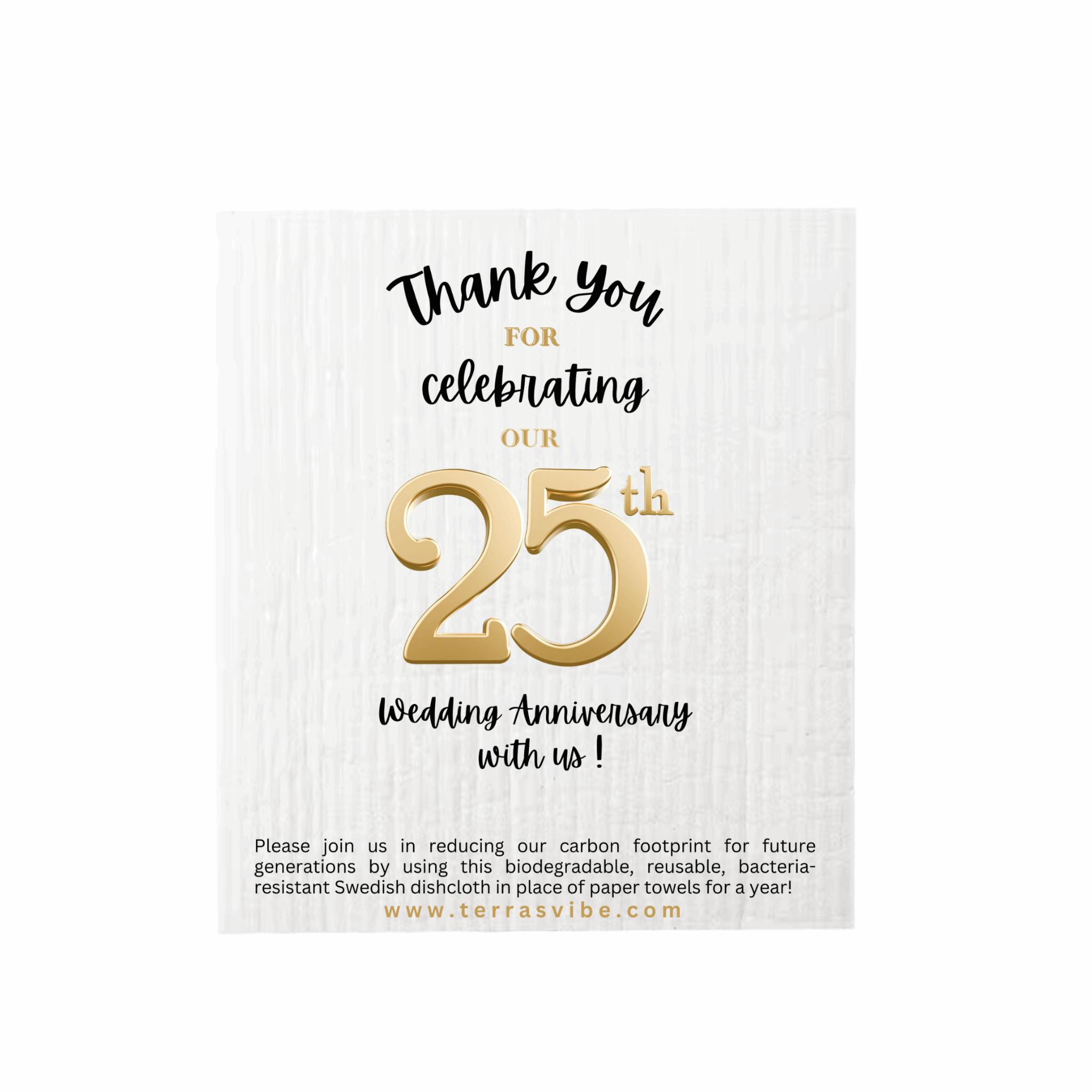 Our 25th and 50th year anniversary Swedish dishcloth party favor will serve as a unique memento of your special celebration. Your guests will appreciate the cost-saving benefits, cleaning performance, and biodegradable nature of this cloth while fondly remembering your anniversary party celebration with each use.