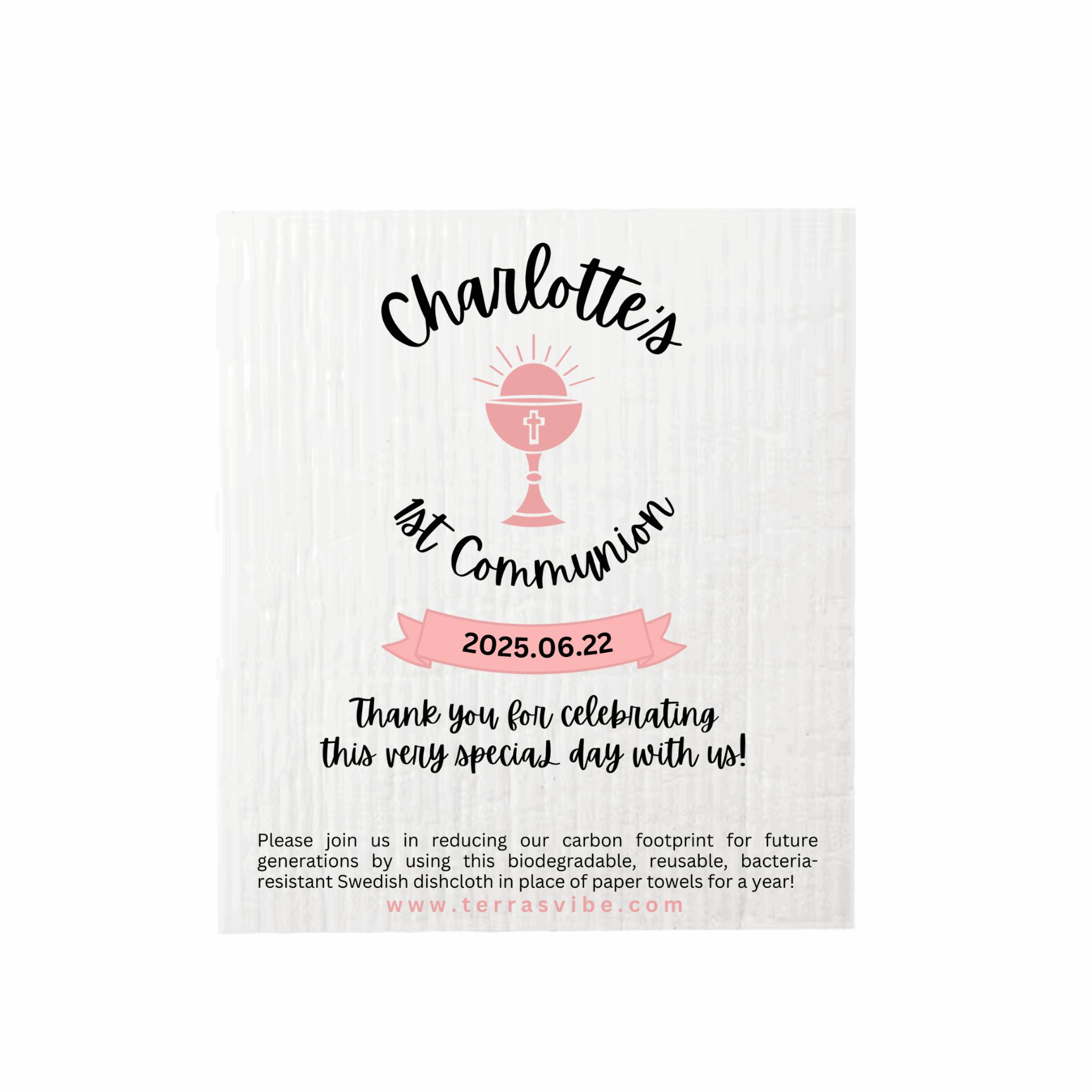 Delight your child's 1st communion guests with a one-of-a-kind Swedish dishcloth that is personalized just for you! Printed with eco-friendly water based ink.