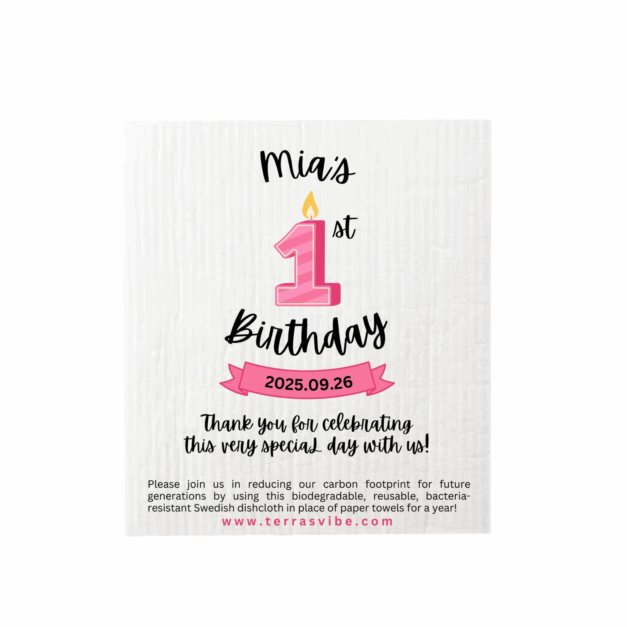 Surprise your guests with a one-of-a-kind Swedish dishcloth as a souvenir of your baby's 1st birthday celebration. Printed in a pink or blue theme using eco-friendly water-based ink and personalized with your baby's name and celebration date. Don't forget to put one aside for your own keepsake!