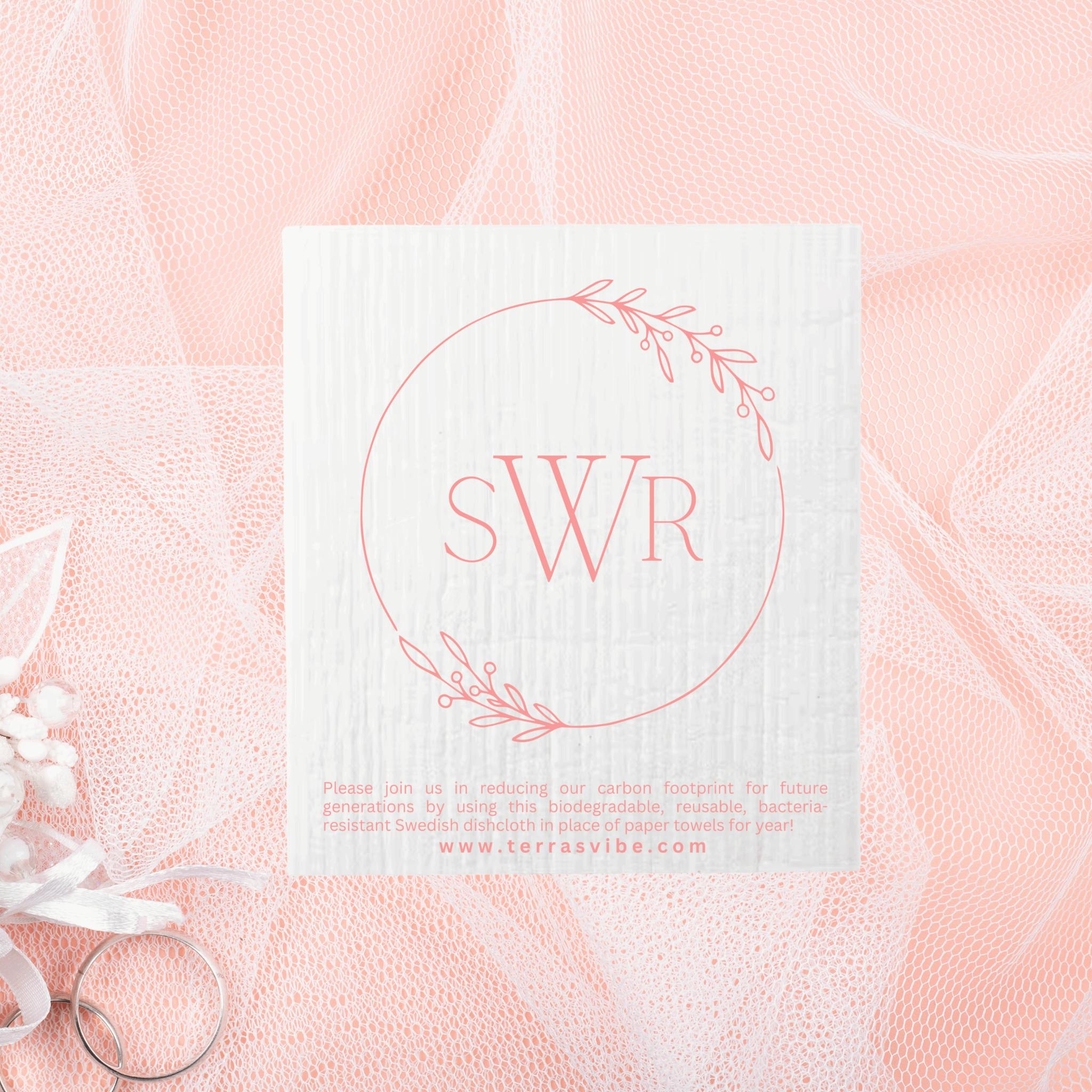 Show your love for the environment by giving a personalized, earth-friendly Swedish dishcloth as a party favor to your wedding guests. Printed with the bride and groom's new last name monogrammed letter, your favor will add brightness to your guests' homes long after the wedding. Replacing the need to purchase single-use disposable paper towels, a Swedish dishcloth will provide your guests with cost savings while also showcasing your thoughtfulness and commitment to sustainability. Your attendees will be sure to fondly remember your wedding celebration each time they use it!
